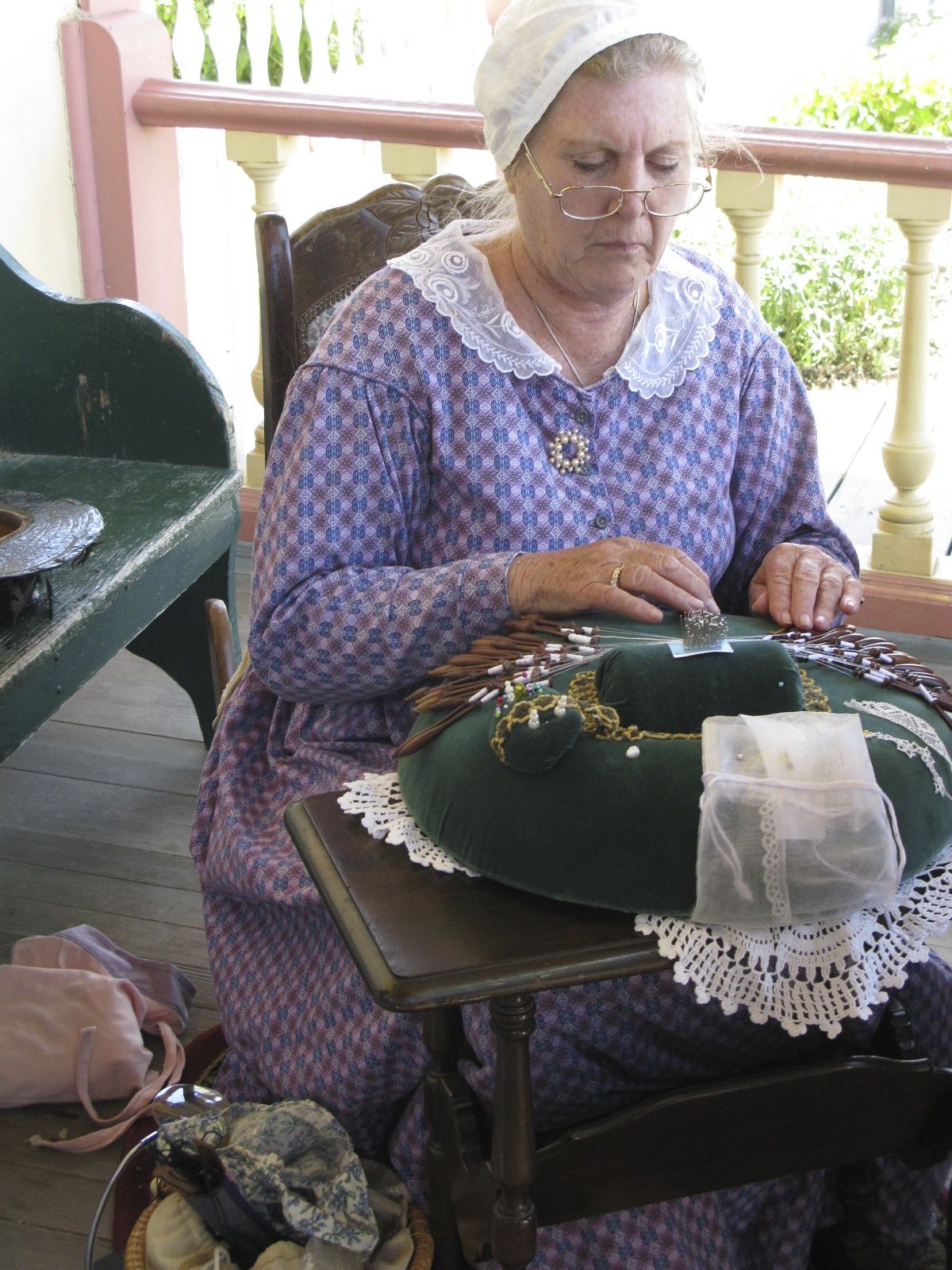 The seamstress demonstrates old-school embroidery and lacemaking, and models a few pieces she prepared earlier... The hurdy-gurdy man entertains with tuneful ditties, including versions of Over The Sea To Skye and She'll Be Coming Round The Mountain. We Scots can't help singing along...